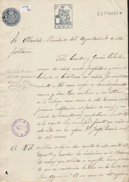 Instancia de Félix Cuartas y García Caballero, para que se le incluya como vecino en la siguiente rectificación del padrón ya que su esposa María Josefa Casado reside en la villa más de seis meses.