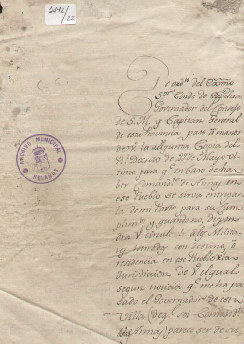 Para que el comandante de armas de la villa reciba copia de un Real Decreto del 27 de mayo de 1798.