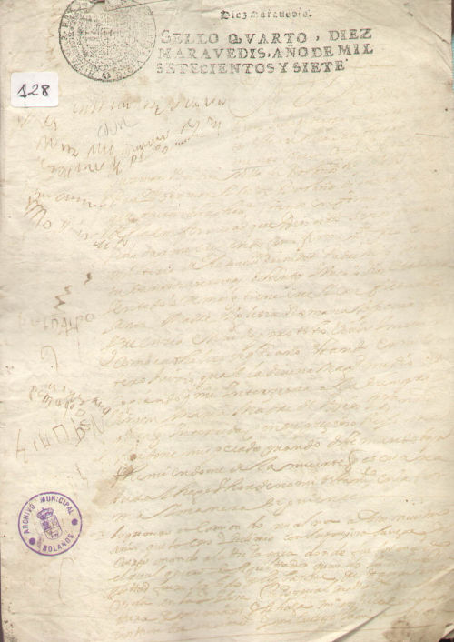 Testamento, letra del s. XVIII, sello real impreso, tinta sepia, regular estado de conservación.