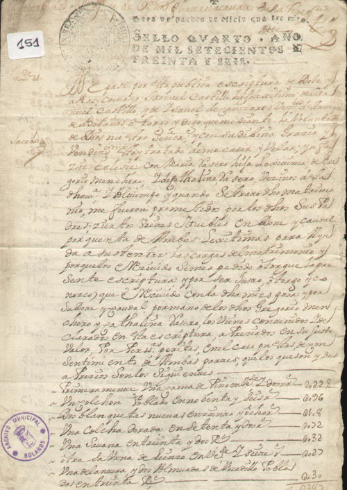 Carta de dote, letra del s. XVIII, papel sellado, tinta negra, regular estado de conservación.