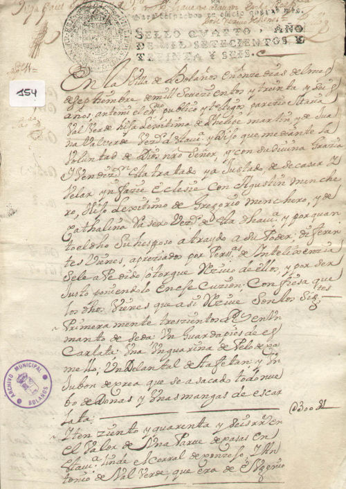 Carta de dote, letra del s. XVIII, papel sellado, sello real, tinta negra, regular estado de conservación.