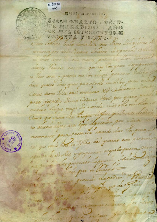 Petición, letra del s. XVIII, sello real, tinta negra, buen estado de conservación.