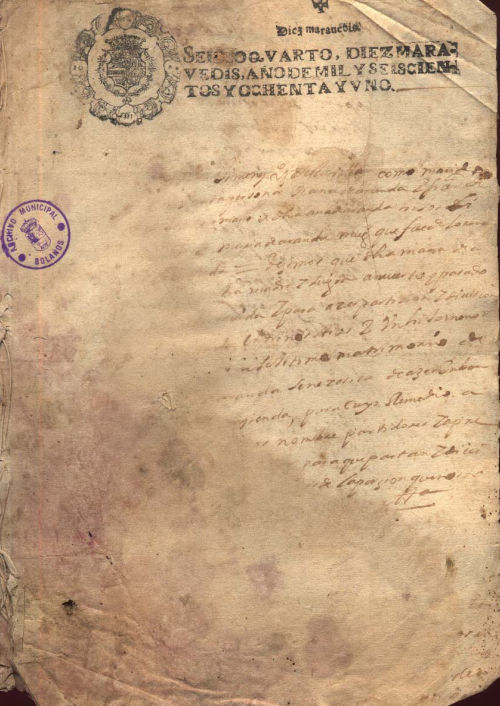 Expediente 1546/7 / Caja 303 / F. Histórico 1681, s.m, s.d. Testamento. Contiene relación de bienes. Testamento, letra del s. XVII, tinta negra, sello real, mal estado. Archivo Histórico Municipal de Bolaños/ Expedientes judiciales por herencia/ 303/ 1546-7/ 6 folios. Descargar