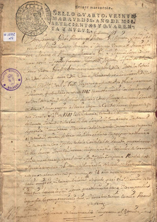 Pleito, letra del s. XVIII, sello real, tinta negra, buen estado de conservación.