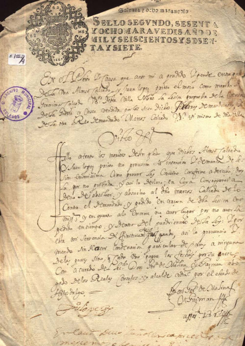 Pleito, letra del s. XVII, sello real, tinta negra, buen estado de conservación.
