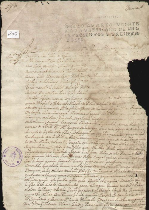 Carta de venta, letra del s. XVIII, papel sellado, sello real, tinta negra, mal estado de conservación.