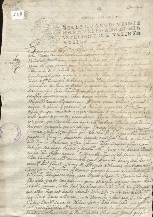 Carta de venta, letra del s. XVIII, papel sellado, sello real, tinta negra, regular estado de conservación.