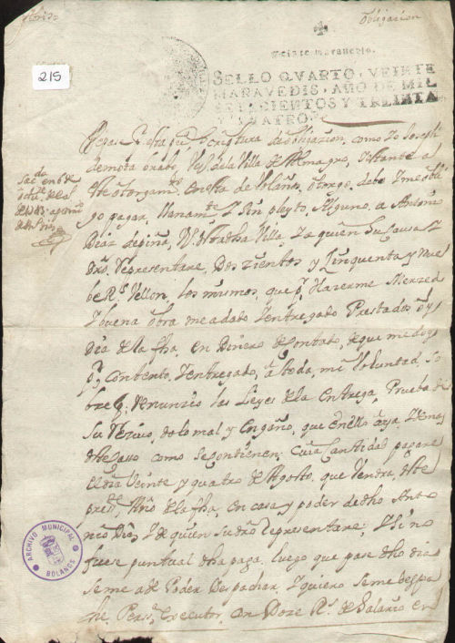 Carta de obligación, letra del s. XVIII, papel sellado, sello real, tinta negra, regular estado de conservación.