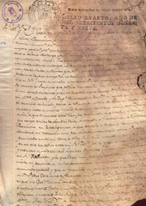 Expediente 278 / Caja 25 / F. Histórico 1789, mayo, 21. Provisión real sobre monedas. Provisión real, letra del s. XVIII, tinta negra mal estado. Archivo Histórico Municipal de Bolaños/ Reales Provisiones/ 25/ 278/ 1 folio. Descargar