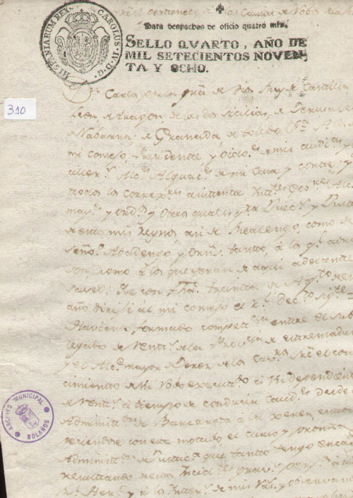 Documento escrito en tinta negra, letra del s. XVIII, papel sellado, sello real, Carlos IV, regular estado de conservación. Cruz.