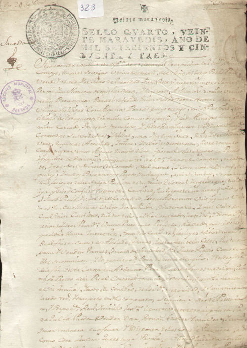 Documento escrito en tinta negra, letra del s. XVIII, papel sellado, sello real impreso, cruz, regular estado de conservación.