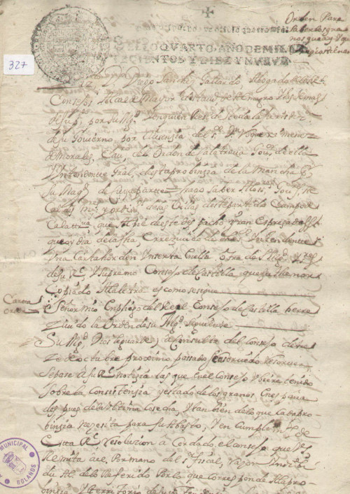 Archivo histórico Municipal de Bolaños/ Reales órdenes/ 26/ 327/ 5 folios.