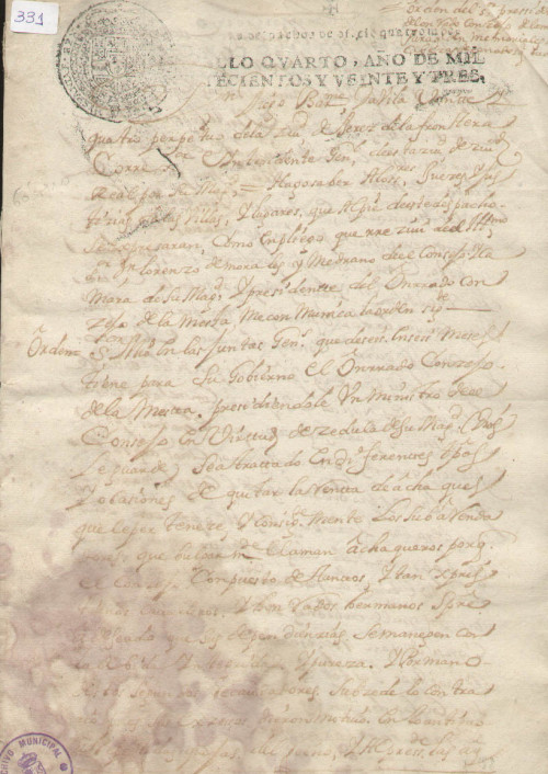 Documento escrito en tinta negra, , letra del s. XVIII, papel sellado, sello real impreso y símbolos, mal estado de conservación.