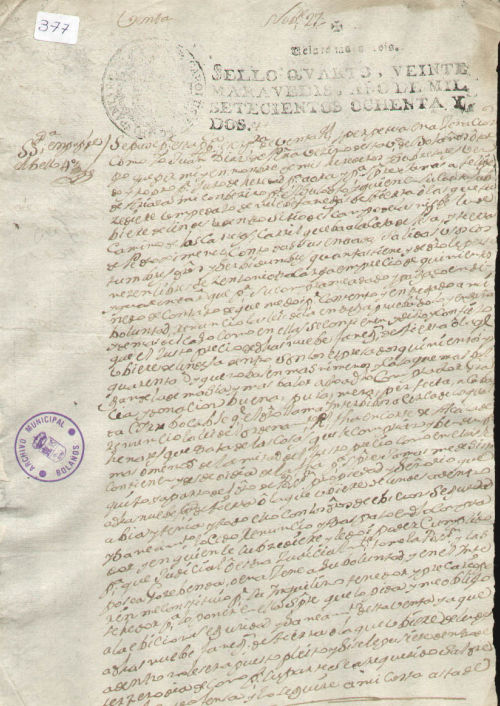 Documento escrito en tinta negra, letra del s. XVIII, papel sellado, sello real impreso, cruz, regular estado de conservación.