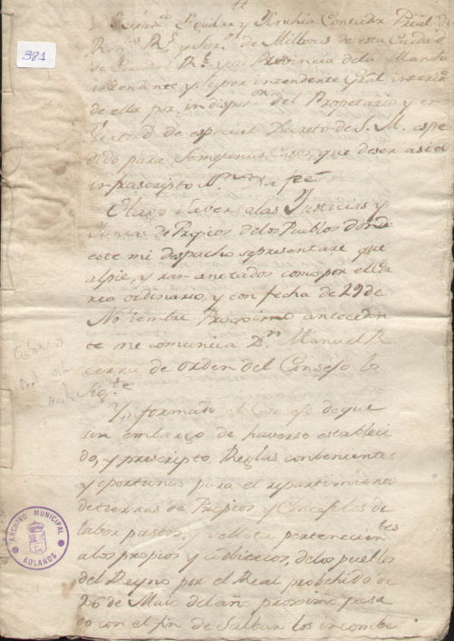 Archivo Histórico Municipal de Bolaños/ 27/ 381/ Reales Órdenes/ 7 folios.