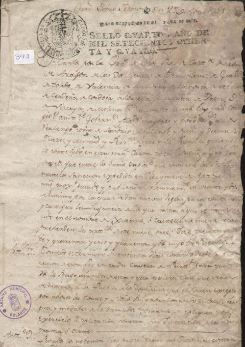 Documento escrito en negro, letra del s. XVIII, papel sellado, sello impreso de Carlos III, mal estado de conservación
