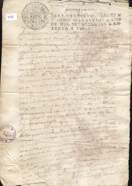Testamento, letra del s. XVIII, papel sellado, sello real impreso, tinta negra, cruz, mal estado de conservación.