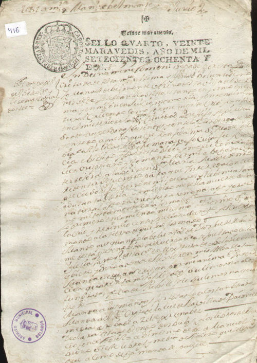 Testamento, letra del s. XVIII, papel sellado, sello real impreso, tinta negra, cruz, regular estado de conservación.