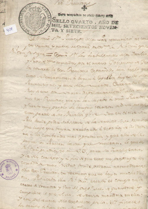 Documento escrito en negral, letra del s. S. XVIII, papel sellado, sello real, Carlos IV, regular estado de conservación.