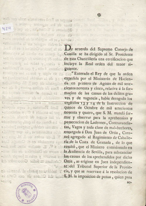 Archivo Histórico Municipal de Bolaños/ Reales órdenes/ 27/ 424/ 2 folios.