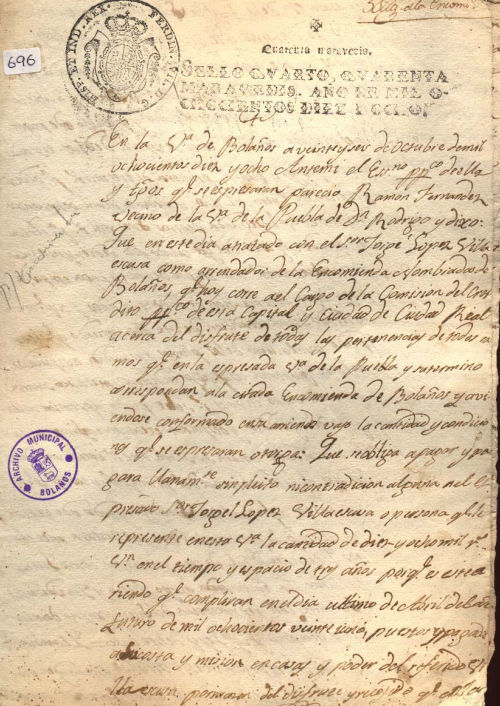 Carta de obligación, letra del s. XIX, tinta negra, sello real, buen estado.