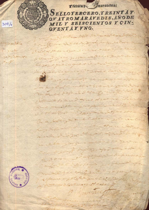 Expediente 9 / Caja 309 / F. Histórico 1650, s.m, s.d. Escrito sobre un tutor de menores . Expedientes, letra gótica-procesal, sello real, tinta negra, mal estado de conservación. Archivo Histórico Municipal de Bolaños/ Expedientes judiciales por bienes de menores/ 309/ 309-9/ 9 folios. Descargar