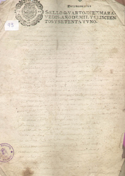 Documento escrito en tinta negra, letra del s. XVII, papel sellado, sello real impreso y cruz, mal estado de conservación.